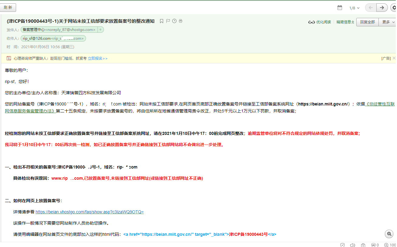 最近很多用戶收到工信部發來“關于網站未按工信部要求放置備案號的整改通知”,郵件大致如下: