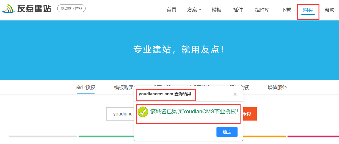 購(gòu)買后自動(dòng)開(kāi)通授權(quán),且可自助查詢域名是否授權(quán)。可在友點(diǎn)官網(wǎng)——》購(gòu)買——》商業(yè)授權(quán)里,查詢授權(quán)是否成功。